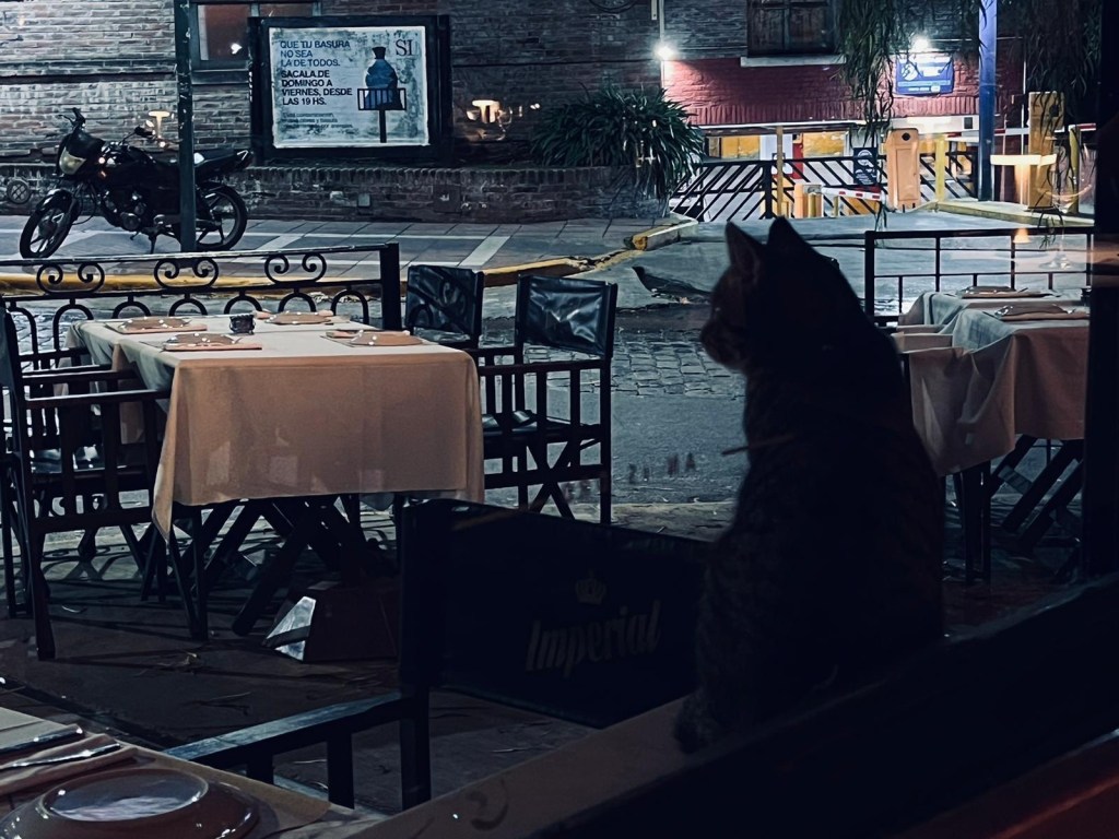 Mientras la noche se yergue cuajando el cielo de estrellas y luz de luna un gato solitario permanece absorto en el andar de los transeúntes. Quizá es abrumadora la charla de la mesa contigua o el rugir de los platos que proviene desde la cocina. Aun así, en su ademán apacible se convierte en la pausa dentro del ruido. En la expresión máxima de quien se siente servido por la vida pese a la arrolladora nostalgia que va y viene con los años.